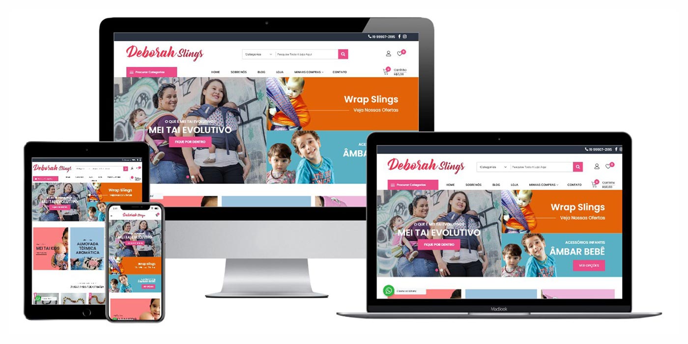 O site/e-commerce Deborah Slings surgiu no final de 2014, do sonho de uma mãe em carregar o seu bebê e de poder passar mais tempo com ele. Deborah é professora de Educação Física, mãe do Lorenzo e da Chloe Sophia e empreendedora materna.